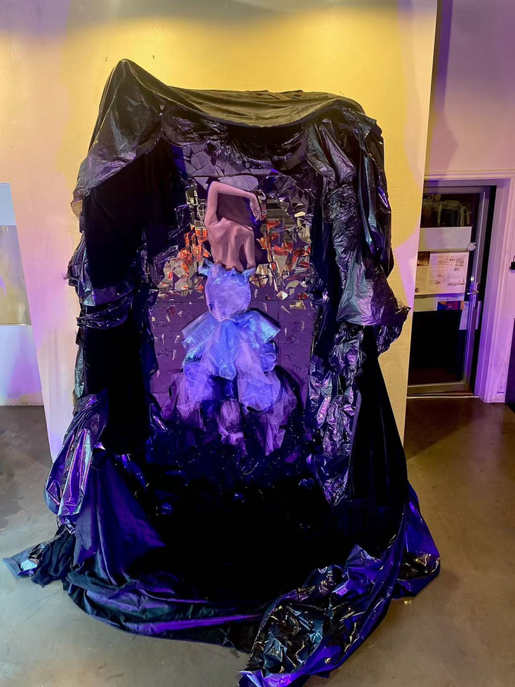 This installation art is a modern art form that can transforms a space into an immersive, three-dimensional designed to surround the viewer through not only the art but the space. Instead of being a single, isolated art object, it invites and stages a complete experience that can stimulate to many senses. This artwork can accommodate any larger spaces with the aim to transcending in experience. This immersive experience in how the audience can view and be part of the artwork by entering and changing the space from public viewing to a one-to-one intimate artwork. This project has a mixture of found objects, fashion, paint, lighting and immersion.